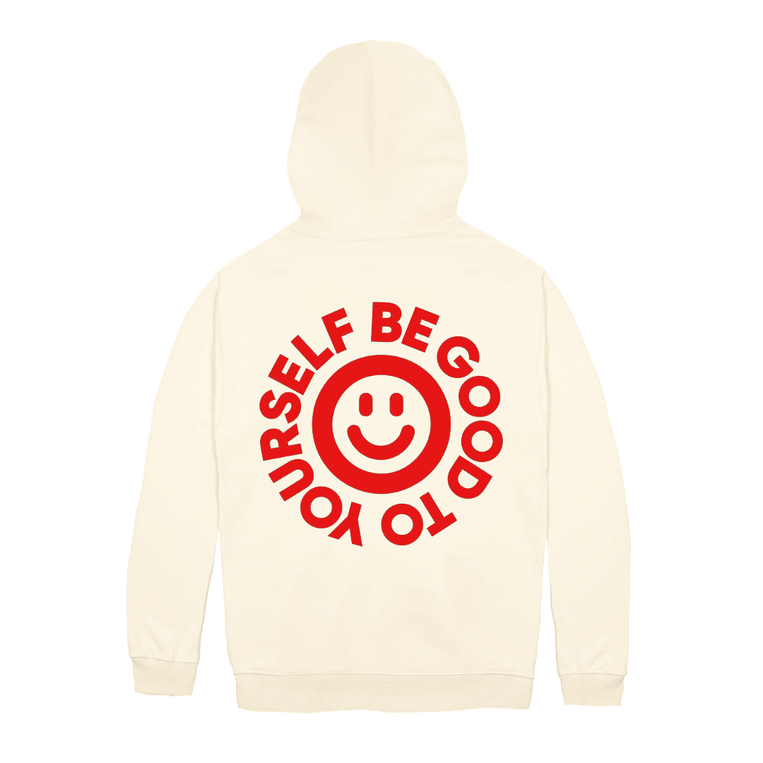 Off-white pullover hoodie. Classic fit with ribbed cuffs and hem, a front kangaroo pocket, and a drawstring hood. The front features the SWAT Health Club logo on the left chest, and the back has a large “Be Good To Yourself” graphic in red. Built for everyday wear and comfort.