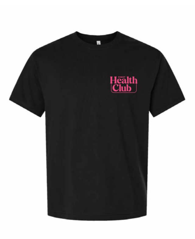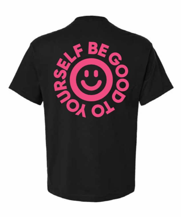 Black short-sleeve crewneck t-shirt. Standard fit with ribbed collar. The front displays the SWAT Health Club logo on the left chest in neon pink, and the back features a large “Be Good To Yourself” graphic with a smile logo printed in neon pink.
